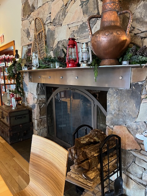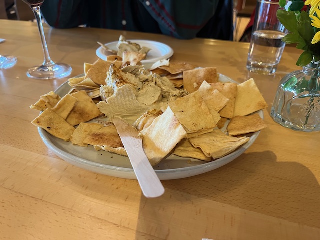 Macari has a cozy bar room with a fireplace, a larger tasting room decorated with a huge tree-like structure in the middle (I’m not sure what to call it, but it is very pretty.), and a generous porch that looks out on the fields and has plastic window coverings, plus some outdoor seating areas and private rooms for groups. The wines are all made from grapes grown and fermented on the estate, and several of them are often available at local restaurants. In addition to a menu of snacks, you can build your own accompaniments from the cheeses and charcuteries and array of crackers and jams, etc., along one wall of the bar room. We ordered the hummus, a generous mound sprinkled with za’atar and olive oil, which came with a hefty serving of pita chips.