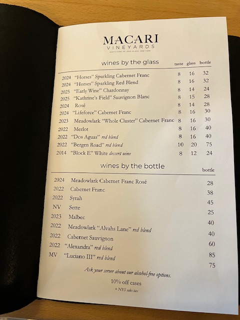 I’ve been to Macari many times, but only a few times for a tasting, since a book club I belong to meets there during the winter months, when business is slow and the tasting rooms and porch are quiet. We always get a bottle (or two, depending on how many of us are there) of white, either the “Life Force” Sauvignon Blanc or, more recently, the Katherine’s Field Sauvignon Blanc. Both are very sippable whites, with enough fruitiness to take the edge off, but not sweet. Easy to drink! And the truffled potato chips go well with both.