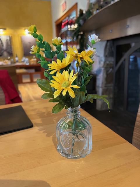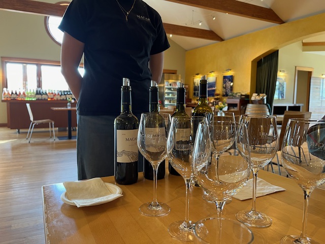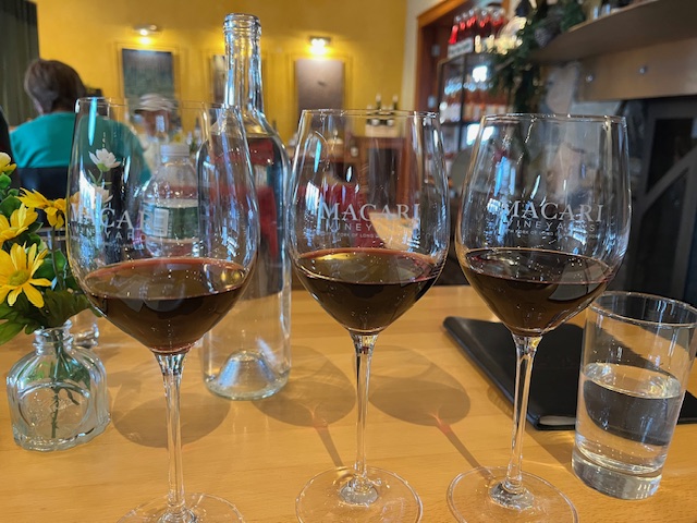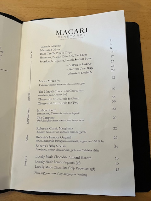 Finally, we settled on three reds to have in common, plus one to share. Abbie, our waitress, was happy to launch into her descriptions of each wine, suggesting the best order in which to taste them, before leaving us to munch, sip, and discuss. All the wines we had were from the 2022 harvest, which was a very good year for reds, as it was hot and dry most of the summer, mimicking the Mediterranean climate. She also proudly informed us that the vineyard employed biodynamic techniques, leading to “clean” wines.