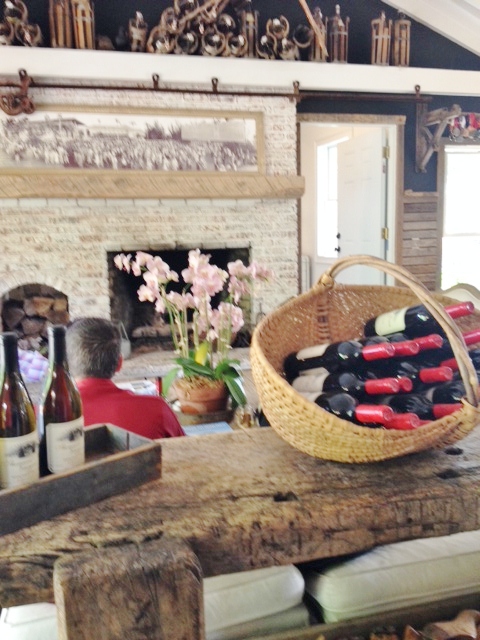 The main room is homey and cozy, with soft couches in front of the fireplace (which actually has a fire in the winter), bunches of flowers, and a wooden bar along one side. You can also opt to go outside, either to a back deck or to a front seating area with picnic tables. On this Saturday afternoon the room also contains a singer/guitar player, strumming folk-ish songs. As we stand at the bar we see a huge party bus pull into the parking lot, but they are clearly headed for the tasting barn out back, where we went last winter for a very enjoyable music performance.