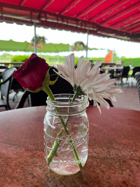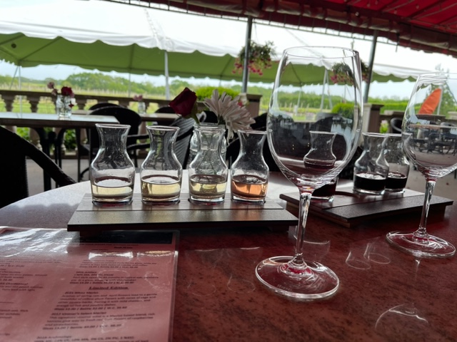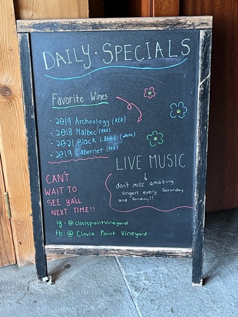 We had done our civic duty and voted in the Board of Education election, and found ourselves at 3:30 in the afternoon with nothing to do, so we took ourselves to Clovis Point. As we sat on the shaded deck, looking out at the sunlit vines and listening to some soft classic rock, I commented to my tasting buddy that this was a very civilized way to spend an afternoon. The chairs are comfortable, and the flowers on each table are a nice touch. We also appreciated the way our tasting was served to us—in a series of little carafes, with each of us getting our own glass. We had told our cheerful and attentive server that we’d be sharing one tasting, since it consisted of seven wines for $30. And indeed, it was plenty, and we left feeling no pain, but also perfectly compos mentis.