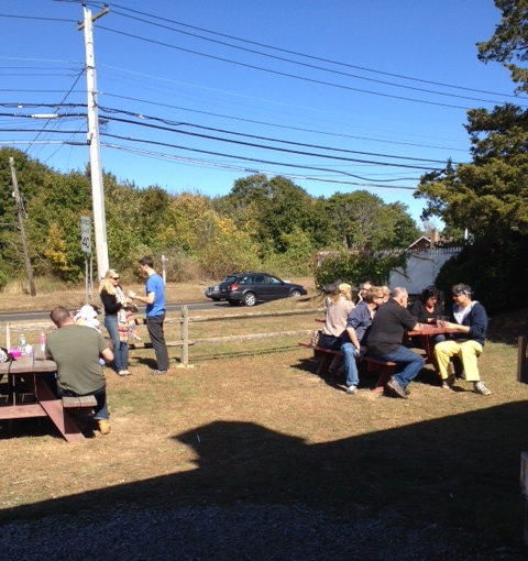 Shortly after we entered the cavernous tasting room at the newly opened Riverhead Cider House, we decided that we were not the target audience. Then we tasted their wares, and were sure. That being said, if you are a twenty-or-thirty-something heading East with a group of friends who like sweet-ish mildly alcoholic drinks or local beers, you might find the Cider House to be just what you’re looking for. As you enter, you’ll see a smaller room off to the side that can be rented for parties and a small alcove where a gift shop is located. Then you enter the large room lined on one side by a long bar and on the other by tables made from repurposed doors (knobs and all!) and tractor seats, plus more comfortable seating areas near the fireplaces. Twin “dueling grand pianos” are in the center of the room, and guitars hang on the walls with notes encouraging their use. Towards the far end is another alcove occupied by a café selling pizzas, salads, sandwiches, huge pretzels, and more. Out the back is a patio with more seating and what has become a necessity for many tasting rooms, bean bag toss games.
