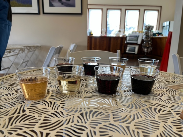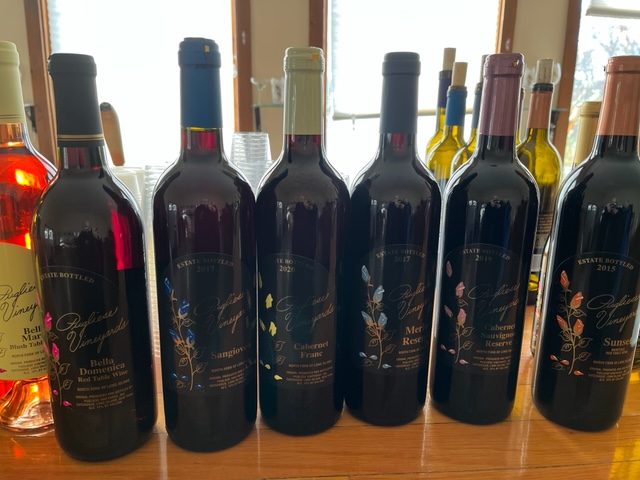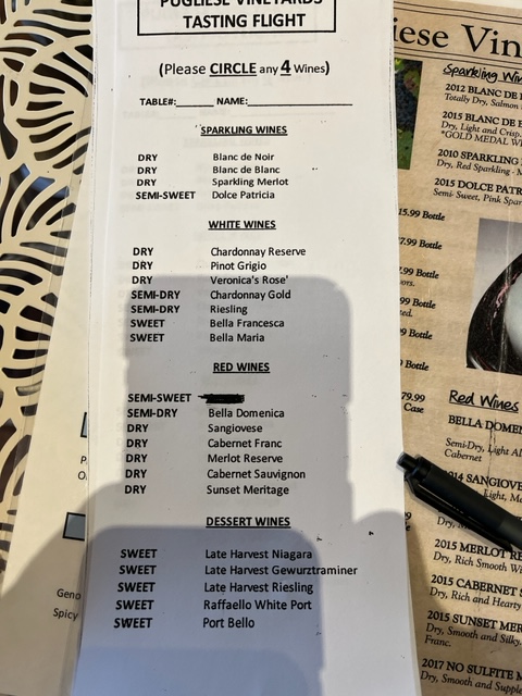 The tasting room was empty on this warm December Wednesday, except for two members of the Pugliese family who were busy preparing gift baskets with their signature hand-painted wine glasses and bottles of wine. We were immediately ushered into another space, where many little metal tables that seem to have escaped from someone’s garden were set up. “We’re offering table service now,” we were informed, as we were handed several menus. One was for the wines currently on offer for tastings, another gave the prices of the bottles with some information on each wine, and the third was for foods on offer. Since we had just had lunch, we were not interested in cheese and crackers, so we just perused the wine list.