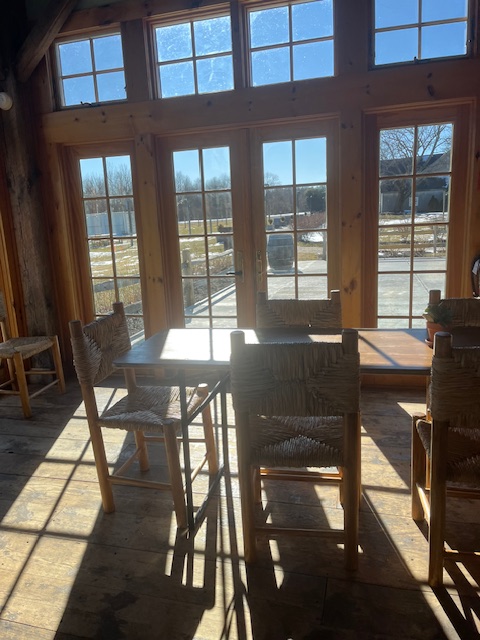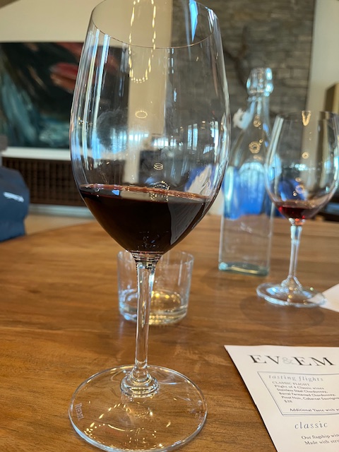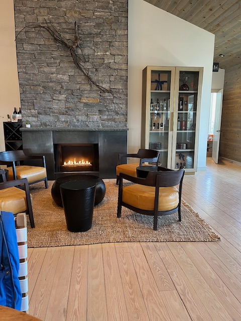 We were sitting in our living room Friday afternoon when I looked out the window and noted that it was both sunny and above freezing—metrological conditions that have not existed for a while.  “Why don’t we go do a tasting?” I asked. So we put on our shoes and headed out to ev&em winery, which we had last been to not long after Dan Abrams bought Laurel Lake and changed, well, everything except the exterior, which still looks like a traditional farmhouse.  Inside, the décor is sleek and modern, with a gas fireplace, a long bar, and plenty of tables and chairs (lacking last time we stopped in!), plus ample seating on a side porch.