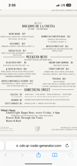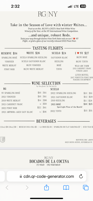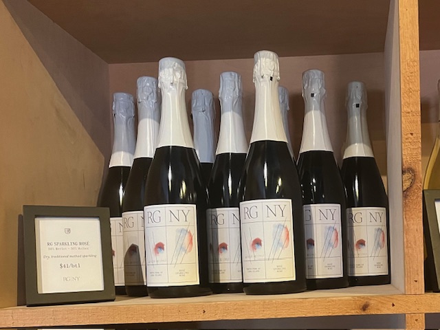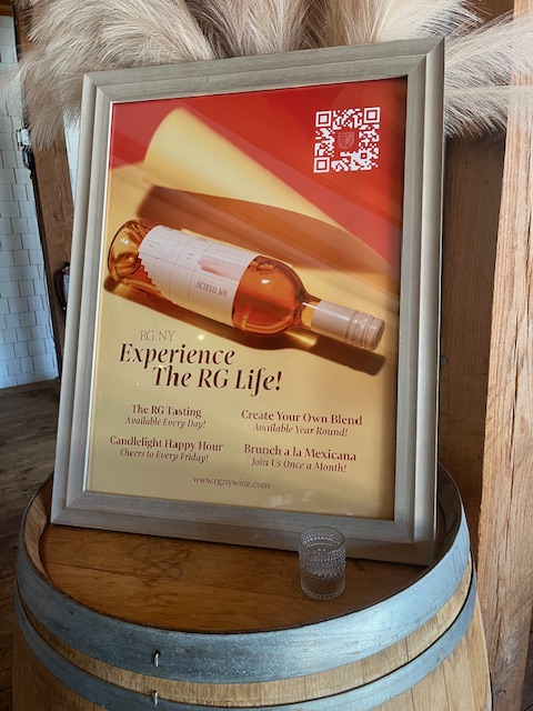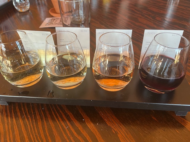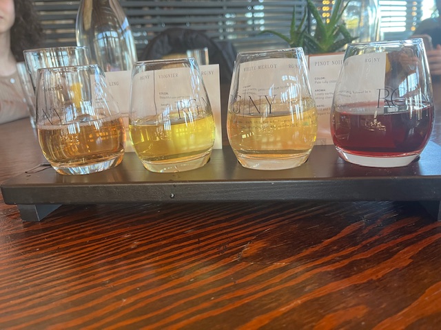 Then it was time to do a wine tasting.  Where to go?  I realized we hadn’t been to RGNY since 2021, and it is close to our house, so off we went.  The main entrance now seems to be the one to the right, as you face the building, so we opened that door and were greeted by John, whom I recognized from other wineries!  He quickly showed our party of six (4 adults, 2 children) to a nice round table in the high-ceilinged, wood-beamed tasting room (which one young guest noted “smells like wood”—sort of like a cabin on a lake), where a QR code on the table sent us to the menus.