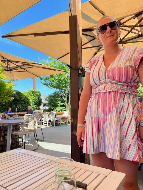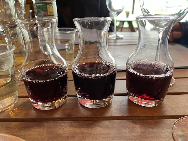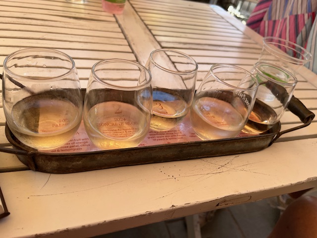 So off we went.  We walked into the tasting room, where Lily greeted us enthusiastically and quickly showed us to a table on the wooden deck overlooking the vineyard.  There were a few other couples enjoying the day, the wine, and lunch, and we were happy to join them.  A slight breeze made the temperature perfect.  We told our server we were getting the “Locals” tasting, and she set us up with three tastes each in little carafes, with a round-bottomed glass into which to pour each wine: a white, a rosé, and a red.  She also gave us a bottle of chilled water and a water glass, welcome on this warm afternoon.