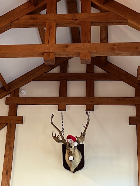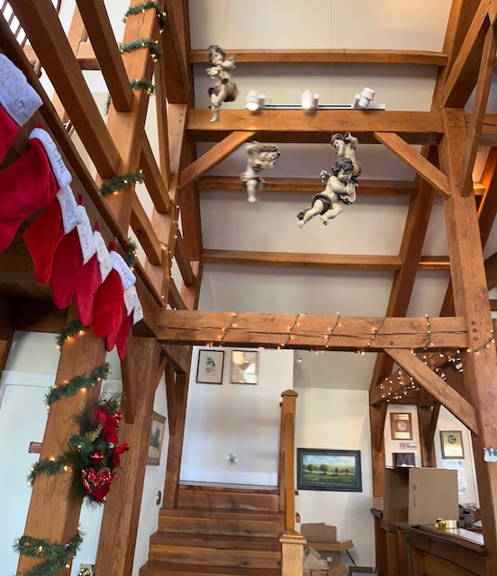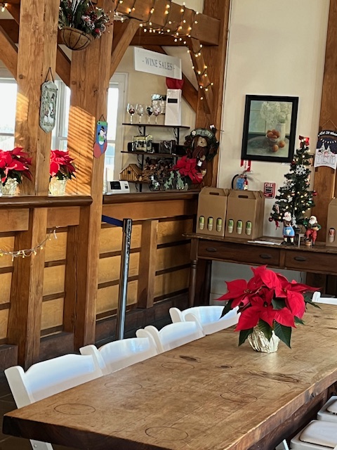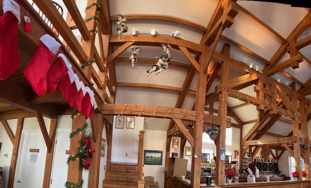 If you’d never been to Pellegrini, you might think those flying cherubs were part of the Christmas decorations, like the stockings hung from the rafters and the poinsettias on the tables, but they are always there.  We know this because we belong to the Pellegrini wine club, and so find ourselves visiting the tasting room with some regularity—like the couple we saw at a nearby table, who had come, like us, to pick up their winter shipment, and were quietly enjoying a glass of wine.