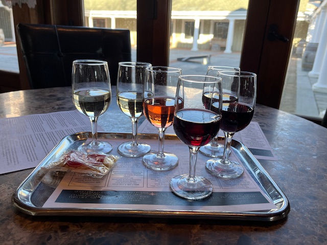 This may look like a lot of wine for one tasting. That’s because our server misunderstood when we ordered, and thought we wanted four flights, not two. Very nicely, he only charged us for what we had ordered.