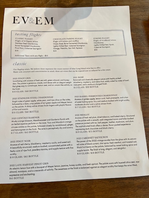 There are three flights to choose from: Classic, of four wines for $38; ev&em, of four for $32; or a wine and chocolate pairing flight, with four wines and four chocolate truffles, for $50. $12 or $18 for four chocolates seemed a bit steep to us, so we decided to share the Classic option.  However, I saw that it included their barrel fermented chardonnay, and since I tend not to like oaked chards, I decided to ask if I could sub in one wine from the other tasting.  We also wanted a little snack, but nothing as big as a cheese or charcuterie board, so settled on a bag of potato chips ($3.50).