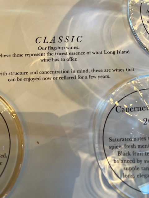 This one doesn’t have much aroma, and is somewhat of a letdown after the pinot noir.  It has some nice spice and berry notes, but not much depth.  And, like all the wines we’ve tasted today, the question of value arises.  Is it worth the price being charged?  Given that there are other North Fork wines of similar quality for less, I think not.  Others may differ, or like the celebrity connection.