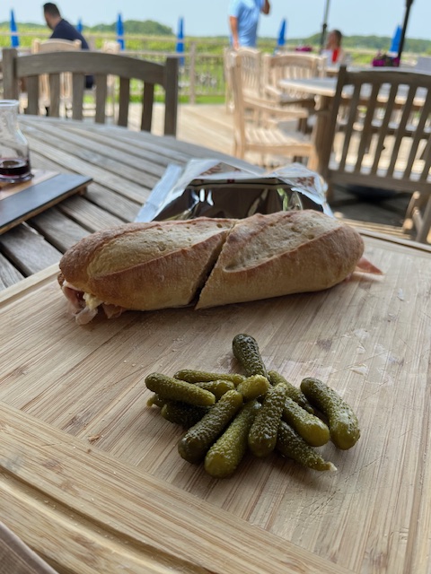 Happily for me, this is a steel-fermented chard, with some interesting characteristics.  It smells piney, and even tastes a bit like pine, plus the usual citrus taste one expects.  I also felt it smelled a bit like lemon candy, with a touch of funk.  Not your ordinary North Fork chard.  My husband dubbed it “likeable.”  I also felt it went well with both sandwiches.  I used to automatically pair cheeses and meats with reds, but I have come to feel that charcuterie and soft cheeses go best with whites or rosés.