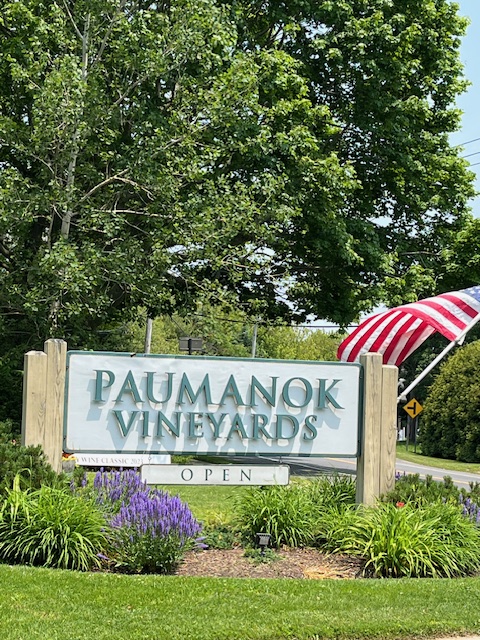 Yes, there are many perks to being a local on the North Fork: the plethora of farm stands spring through fall; the closeness to the seashore; the friendly neighbors; sightings of deer, turkeys, egrets, bunnies, and even groundhogs; and more, but one of my favorites is being able to pop out to a winery whenever one wants.  And this past week we discovered a good reason to head out to a tasting, because many of the wineries were offering special deals for “Locals Week,” from free tastings to a free glass of wine.  So the question was, where to go?  Mother Nature solved one part of the conundrum for us, by giving us a beautiful, warm, sunny day (We went from having the heat on to turning on the A/C almost overnight.), meaning sitting outside was a good idea.  Then I decided we needed to go somewhere that served lunch, and Paumanok seemed perfect.