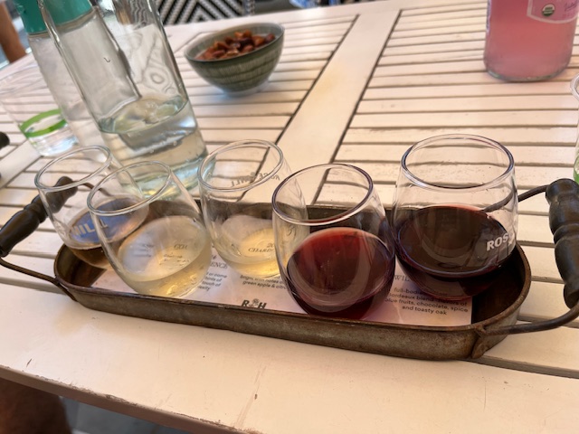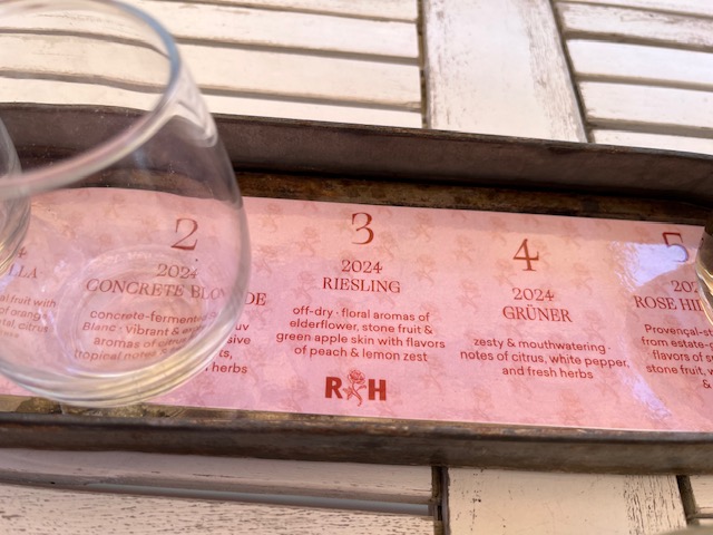 Rose Hill (named for a street the owners had lived on) offers three flights: Summer, Classic, and Red, each featuring five wines for $30.  My husband and I decided to share the Summer flight, one guest also chose that one, and another decided on the Classic Flight (a third couple had already been to a couple of tastings, so they opted to share a glass of the Brut Rosé and a bottle of Saratoga sparkling water).