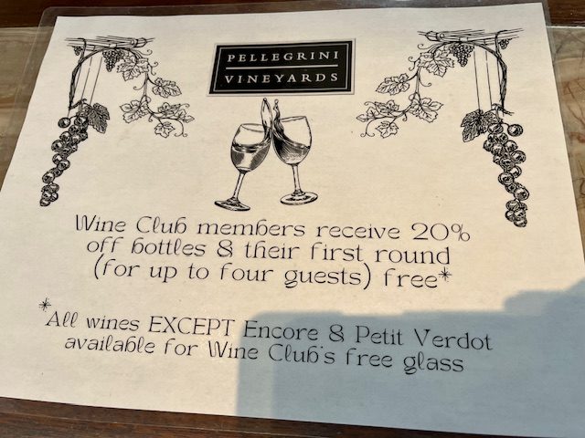 However, it was certainly quiet in the Pellegrini Winery tasting room on this beautiful September afternoon.  We had gone there to pick up our wine club shipment, but when we arrived the place was empty, though the door was propped open.  Hmmm…But after a moment, Tammy came in, apologizing.  She had been serving some people who were sitting outside.  We quickly collected our three bottles, and then picked out a tasting featuring all three, so we could see if we wanted to order more of any of them.