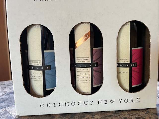 We opted to get “reds only” in our shipments—we could have opted for a mix or whites only—because we generally feel Pellegrini has some of the better reds on the North Fork.  We really like the North Fork Project Merlot, made by Pellegrini, one of the best wine bargains on the East End, with three one liter bottles for $36.  We like that better than this, pricier, merlot, which is 2% cabernet sauvignon and which my tasting buddy describes as “Meh.”  Not bad, but just okay.  I could see it with roast chicken.  It is dry, with some hints of cherry.