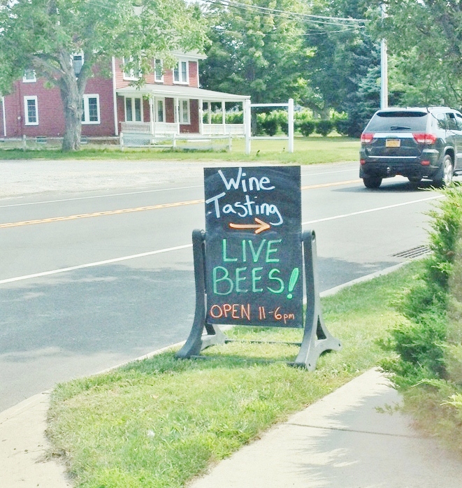 The small, cheerful yellow tasting room is in a small building on the Main Road, and consists of a bar and some stools, plus shelves featuring wine-related items but also many honey products from the bee-keeping business Blossom Meadow run by his wife, Laura Klahre, who is also a very likeable presence behind the bar. On one wall you can see a beehive behind glass, and Laura will happily explain to you what exactly is going on in it. She is also in the process of creating a “Wineosaur,” a wire sculpture on the front lawn which she is creating using corks. Some day she hopes to attach it to some skateboards and join a local parade.