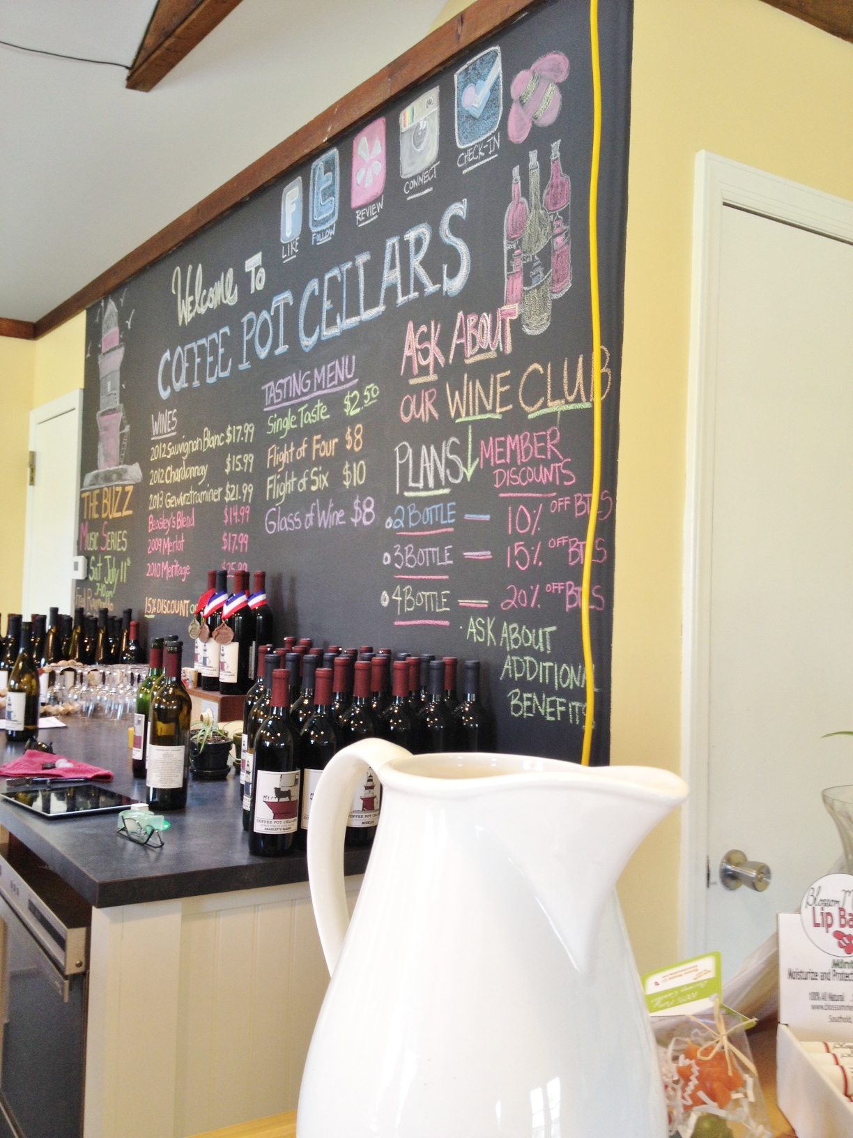 “So, the way to grade a wine is this: you bring the bottle to a party. At the end of the night you look to see—if the bottle is empty, it was good. But if it is still half or three quarters full…” All of us gathered at the bar of the Coffee Pot Cellars tasting room chuckled at Adam Suprenant’s joke, one of a number of humorous comments with which he entertained the small group. No joke, however—if you bring one of his bottles of wine to a party, don’t expect to take home any leftover wine!