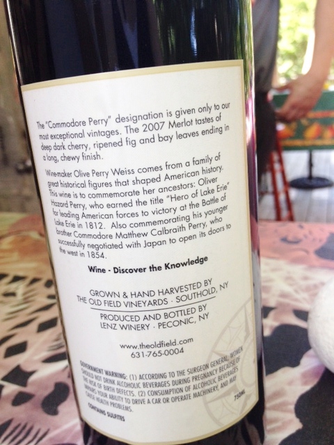 Named for the illustrious ancestor of the current owners of the vineyard, this is a wine they only make in good years. Cherry, tobacco, chocolate, thyme, juniper or bay leaf were some of the taste descriptors we used for this merlot. Also, “serious legs” and “very good.” We also learned that it was quite appropriate to name a wine for Commodore Perry, since he was known to carry wine with him on his voyages to give as gifts.