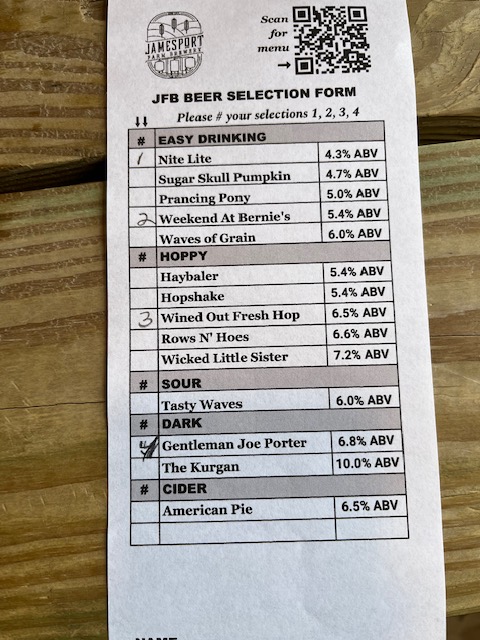 When you enter the parking area from Oregon Road, you will see four parking spots reserved for the overnight guests of the Inn, plus a pebbled lot for everyone else. The parking used to be around the back, but no more, though that is where you’ll find the entrance to the tasting room. We were cheerfully greeted by one of several pleasant young women who circulated around the patio, and told we could choose whichever table we liked. We picked a table for the four of us that was well shaded, and settled down to read the menu, which one acquires via a QR code embedded in the table top.