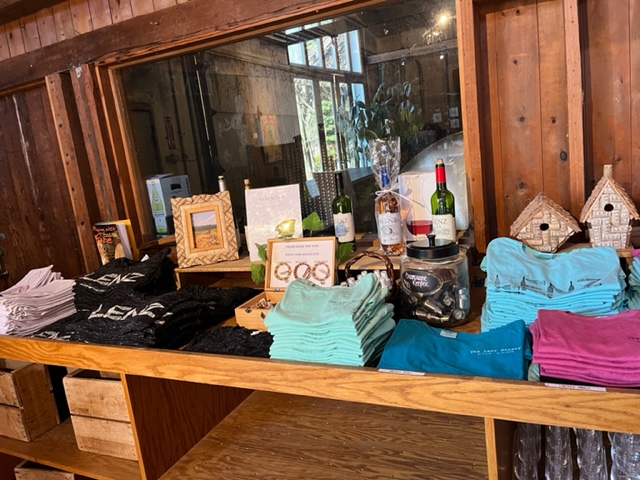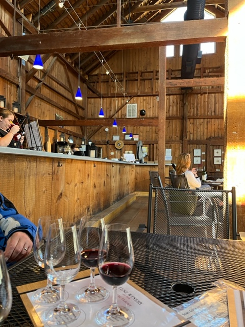 We had not been there since Covid, opting to have our selections sent to us, so it was interesting to see their adaptations. The outside patio area is now enclosed in clear plastic, with propane heaters which quickly made sitting out there comfortable, though we kept our jackets on. They request that you make a reservation most days, though Tuesday is not one of them, since they are a small space. They also ask that you wear a mask inside the building, but, obviously, the masks come off when you sit for a tasting! They have clever wire racks, which hold five glasses vertically, thus making the most of the limited table space, and they also offer a menu of snacks, which is new. Our cousin picked up a bar of sea salt chocolate for us to share, since we hadn’t had room for dessert at the restaurant.