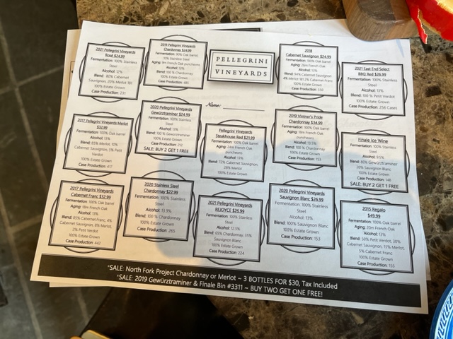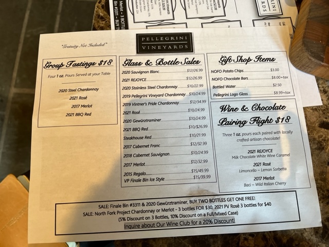 Reasons to visit: pleasant tasting room where buses and limos are verboten; you can bring your own snacks; dogs are allowed; the comfy chairs are conducive to lingering; with fourteen wines to choose from (twelve of which I’ve mentioned), there are wines for every taste; my favorites are the steel chardonnay, the Steakhouse Red, and Regalo; one friend likes the gewürztraminer and the ice wine, the other the VP chardonnay and the cabernet sauvignon, plus the North Fork Project Merlot.