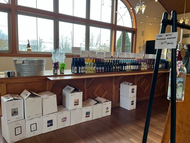 We were sitting in our living room Friday afternoon when I looked out the window and noted that it was both sunny and above freezing—metrological conditions that have not existed for a while. “Why don’t we go do a tasting?” I asked. So we put on our shoes and headed out to ev&em winery, which we had last been to not long after Dan Abrams bought Laurel Lake and changed, well, everything except the exterior, which still looks like a traditional farmhouse. Inside, the décor is sleek and modern, with a gas fireplace, a long bar, and plenty of tables and chairs (lacking last time we stopped in!), plus ample seating on a side porch.