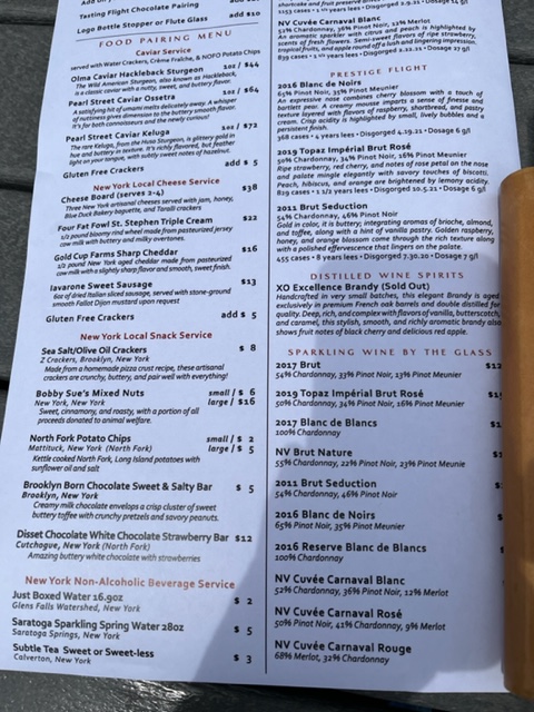 We were immediately greeted—well, there were only two other couples there—and told we could sit anywhere we chose, so we took a table facing the fireplace. I mean, it was above freezing, but not exactly summer. Still, sparkling, or tap? We chose tap, a chilled bottle of which was promptly provided. (Sparkling or still would have set us back $5 or $10, depending on the size.)