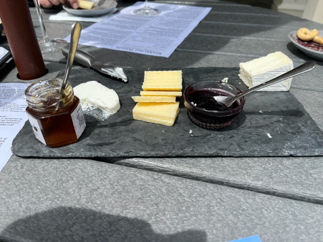She returned with a placemat with circles for the four tastes and four wine glasses, two of which she filled with the two chardonnays on the menu, then added a glass of the red. There was plenty to share. After a while, another server came with the two reds in the tasting, and I reminded her that we had asked for chips. She handed us a bag, and then I had to ask for napkins as well. (Most wineries will give you a plate or two for chips.)