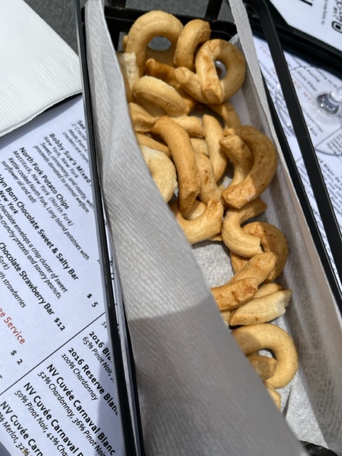 There are three flights to choose from: Classic, of four wines for $38; ev&em, of four for $32; or a wine and chocolate pairing flight, with four wines and four chocolate truffles, for $50. $12 or $18 for four chocolates seemed a bit steep to us, so we decided to share the Classic option. However, I saw that it included their barrel fermented chardonnay, and since I tend not to like oaked chards, I decided to ask if I could sub in one wine from the other tasting. We also wanted a little snack, but nothing as big as a cheese or charcuterie board, so settled on a bag of potato chips ($3.50).