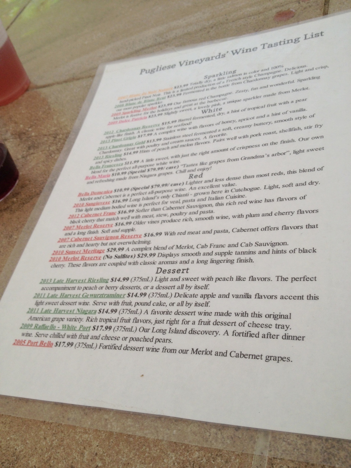 Our server boasts that they are the only winery on the North Fork to use this grape, which is the gape used in Chianti.  As we sniff, we note aromas of tobacco and some fruit.  Then we taste, and promptly dump.  Well, this wine is not going to make a red wine drinker out of my friend!  Bad.