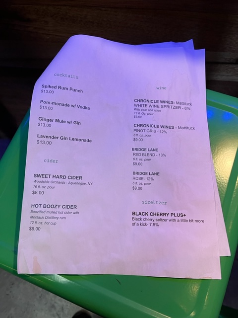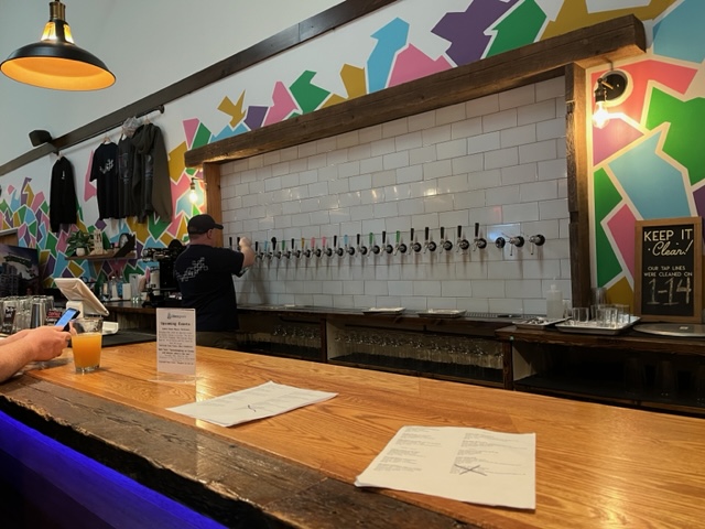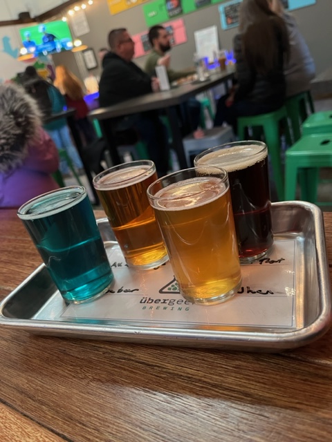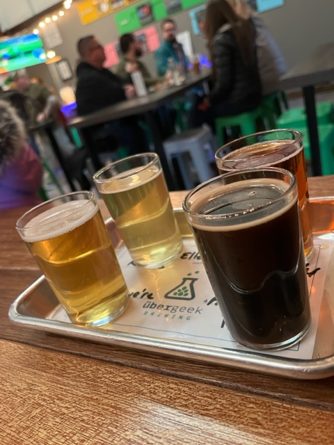 We entered on this President’s Day weekend with our guests to find the small room fairly full, with what seemed to be mainly locals, enjoying pints and chats with friends, or playing a board game from the selection on a shelf off to one side. We managed to find seats—uncomfortable metal stools—for our group of six at a long table, and sent a delegation to the bar to find out if they had flights. Though there were plenty of signs on the walls—describing the beers, giving notice of upcoming events of various sorts—nothing said anything about flights. However, the sole server came over to tell us that yes, they do flights, four of any of their ten beers for $13. So we discussed our options with each other, and decided to get two flights, careful not to overlap, so we could sample eight of their brews. The server then gave us little cards on which to write our selections.