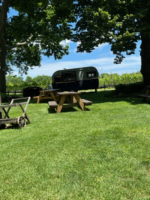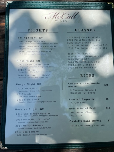 The turn-off to the McCall winery is rather subtle, and easy to miss, but it is basically across the street from Pellegrini. You drive around back to a grassy parking area, where you see a lawn dotted with picnic tables and a rustic barn. Inside, there’s a new bar, which wasn’t there the last time we came in 2018, and a couple of stalls with cozy seating areas. Since it was a beautiful day, we opted to sit outside, and Mrs. McCall supplied us with menus. In a few minutes, a server came by with glasses and a bottle of water, a nice touch.