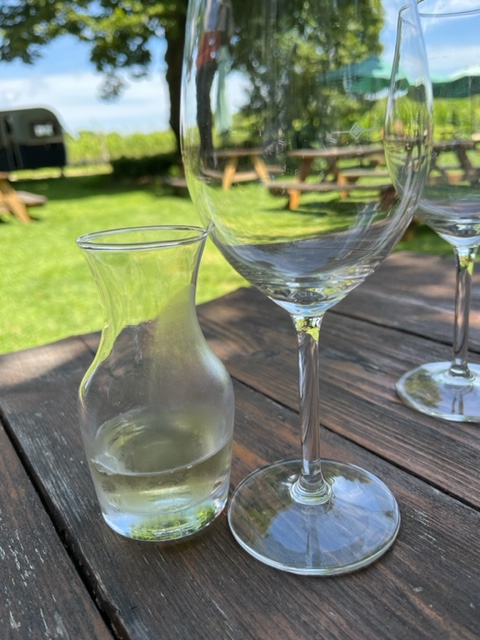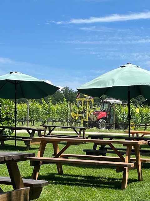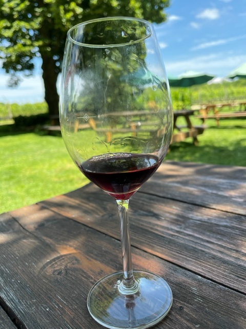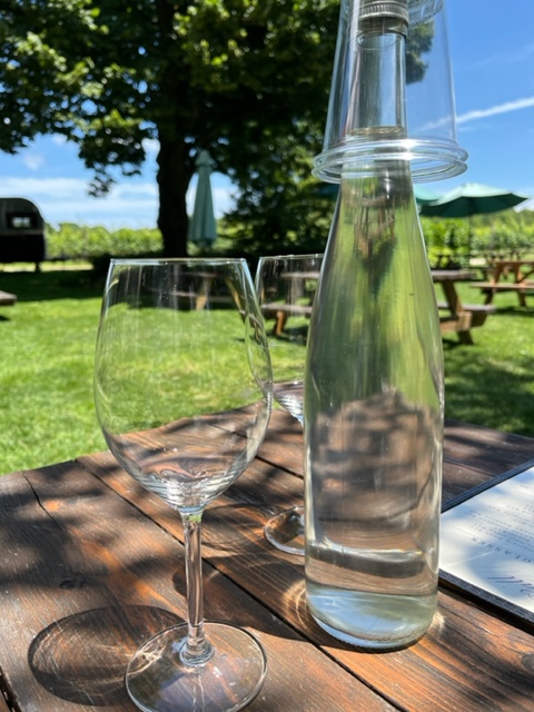 Service is friendly and informative, and we chatted with one server about how they fared during the pandemic, since we had not been there since before it. “We were busier than ever,” she informed us. People just were grateful to have someplace to go, and were very respectful, masking if they got up from their tables, for example. She noted that the outside tables are well-spaced. The view is bucolic, as you look out onto the grape vines—though the sense of country peace was temporarily marred as a trimming machine was going up and down the rows. Fortunately, it finished well before we did.