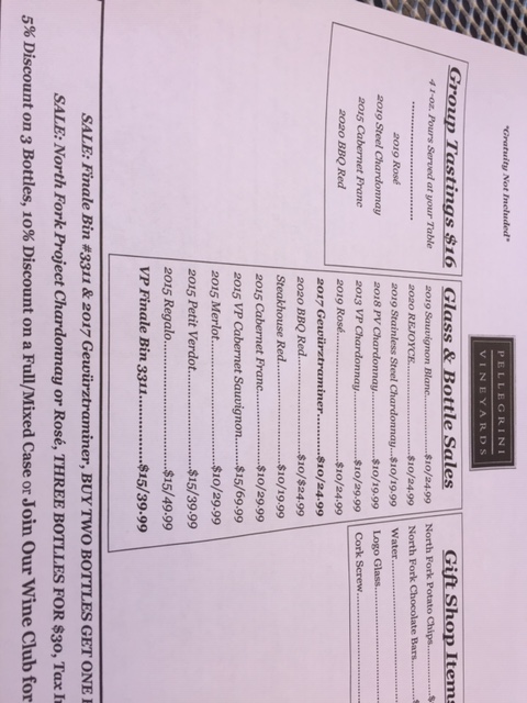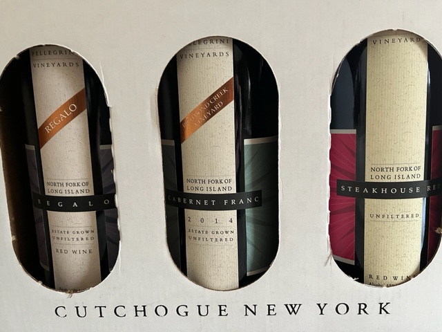 We opted to get “reds only” in our shipments—we could have opted for a mix or whites only—because we generally feel Pellegrini has some of the better reds on the North Fork. We really like the North Fork Project Merlot, made by Pellegrini, one of the best wine bargains on the East End, with three one liter bottles for $36. We like that better than this, pricier, merlot, which is 2% cabernet sauvignon and which my tasting buddy describes as “Meh.” Not bad, but just okay. I could see it with roast chicken. It is dry, with some hints of cherry.
