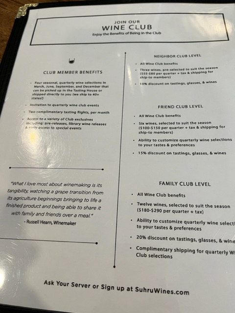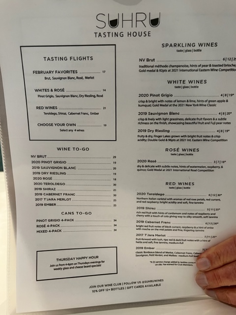 Like our last tasting, at Coffee Pot Cellars, Suhru is located in what was formerly a house and has a similarly welcome, family vibe. Susan Hearn is behind the bar, and is quick to explain, as she hospitably offers glasses of water, that the name of the winery is composed of her name, her husband Russell’s name, and the initial of their last name.