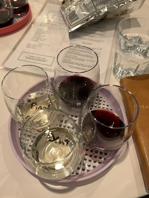 Why Ember, I ask? Susan explains that they just called this “red,” and their wine club members objected that it was too good a wine to have such a meh name, so they had a contest to name it, and ember won. She feels like it captures the warmth of sitting around a fire and sipping this Bordeaux blend. It is 49% merlot, 25% cabernet sauvignon, 18% cabernet franc, and 4% each petit verdot and malbec, though they may vary the proportions from year to year, depending on the qualities of each grape’s juice. Again, we get a slightly funky, forest floor aroma, plus tobacco. She says it has a long finish, but we don’t find that. I taste blackberries. We think this either needs more or less time to age—not sure which!