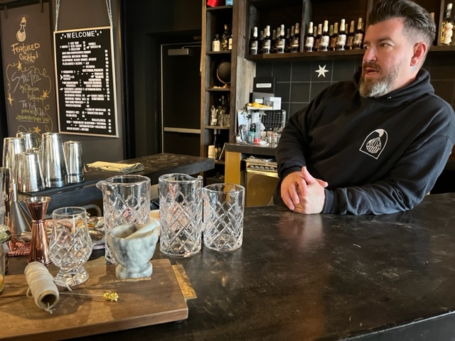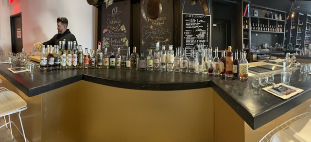 From the parking lot you walk into the tasting room, an airy space only open on Saturdays from 1-6, with a few small tables and comfy stools at the bar. The room is decorated with bottles and bottles of their products, plus blackboards listing cocktails. A panoramic display of their current offerings, by my count over thirty, is displayed on the bar. We were lucky enough to be greeted by Paul, one of the owners, who enthusiastically explained what they do and carefully curated our tastings based on what we told him of our likes and dislikes.